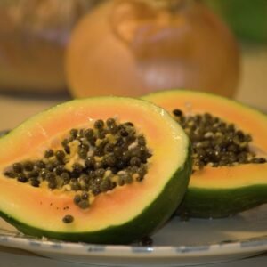 Papayas contain vitamins C, A, E, folate, fiber and a high level of antioxidants, including lycopene.